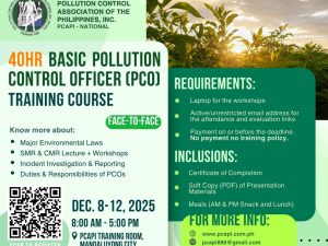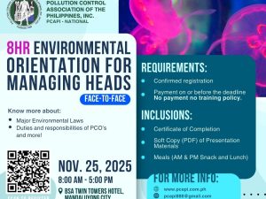 The POLLUTION CONTROL ASSOCIATION OF THE PHILIPPINES, INC. (PCAPI) – NATIONAL is a recognized training organization pursuant to Section 13 of the DAO 2014-02 Revised Guidelines for Pollution Control Officer Accreditation with Certificate of Recognition COR No. 2024-19-R, that will offer the 40-hours training for Pollution Control Officers. In relation to this, PCAPI NATIONAL, in […]
