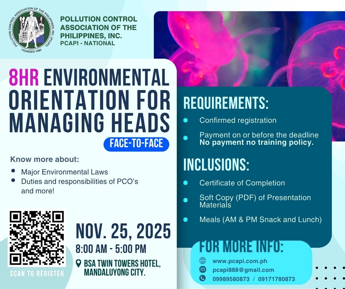The 8-Hrs Environmental Training for Managing Heads is scheduled on November 25, 2025, from 8:00 am to 5:00 pm at the BSA Twin Towers Hotel, Ortigas Center, Mandaluyong City. Participants will be limited to forty (40) only and a minimum of thirty (30) paid participants to proceed with the training. Reservations, therefore, will be on a first-come-first-served basis.