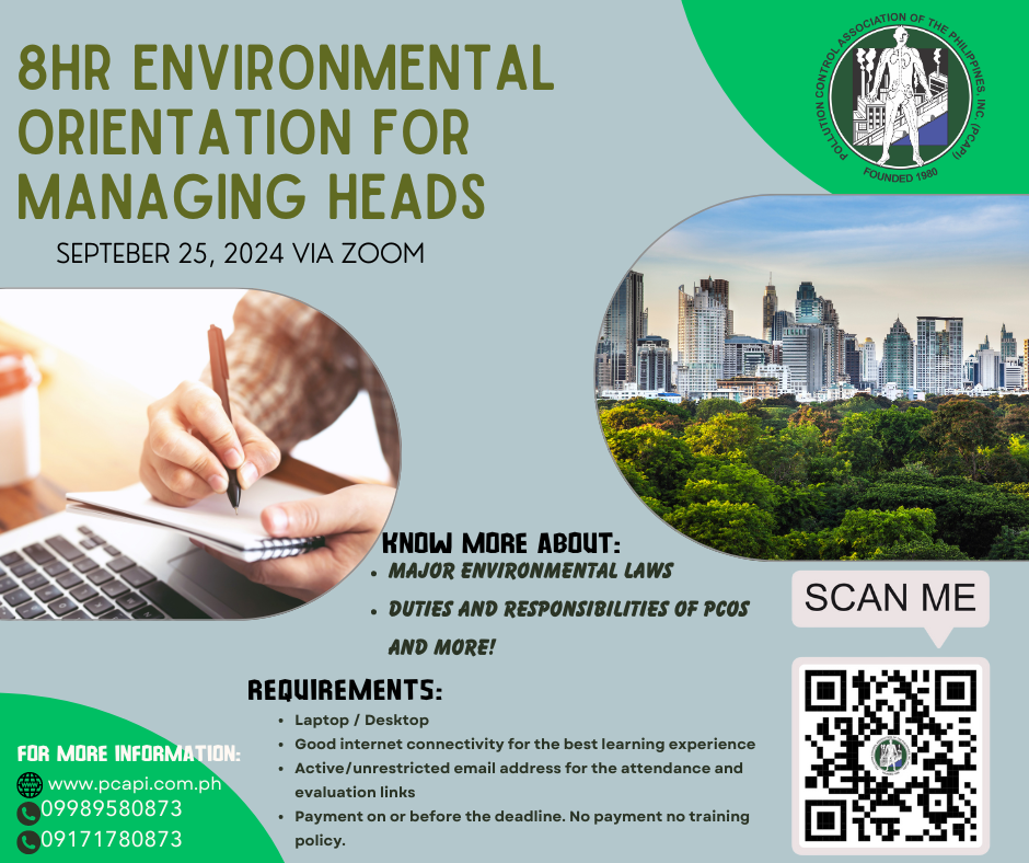 In relation to this, PCAPI NATIONAL, in collaboration with the DENR-EMB is conducting the ONLINE 8 HOURS ENVIRONMENTAL ORIENTATION FOR MANAGING HEADS required under Section 8 Accreditation of PCOs of the DAO 2014-02 Revised Guidelines for Pollution Control Officer Accreditation. The online training will be conducted in accordance with EMC 2020-29 Guidelines on the Conduct of Online Training for Pollution Control Officers (PCOs) and Managing Heads.