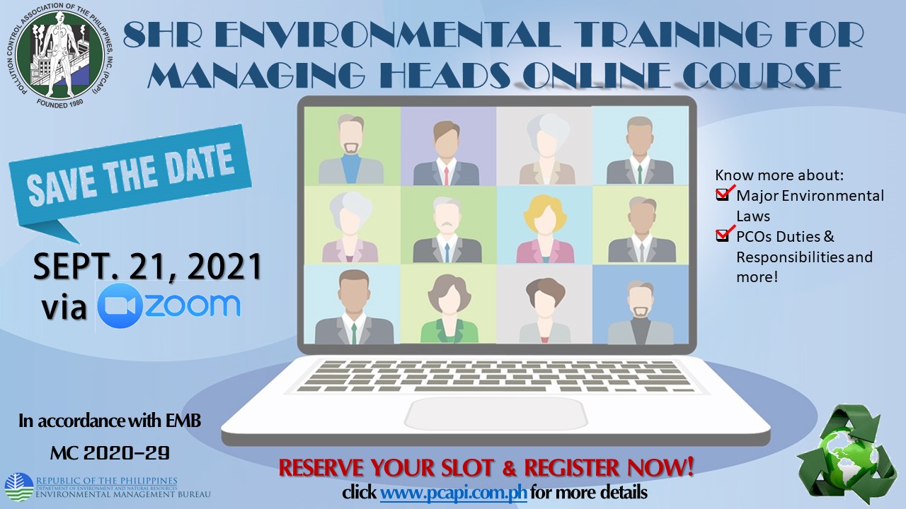 In relation to this, PCAPI NATIONAL, in collaboration with the DENR-EMB is conducting the ONLINE 8 HOURS ENVIRONMENTAL MANAGEMENT TRAINING COURSE FOR MANAGING HEADS required under Section 8 Accreditation of PCOs of the DAO 2014-02 Revised Guidelines for Pollution Control Officer Accreditation. The online training will be conducted in accordance with EMC 2020-29 Guidelines on the Conduct of Online Training for Pollution Control Officers (PCOs) and Managing Heads.