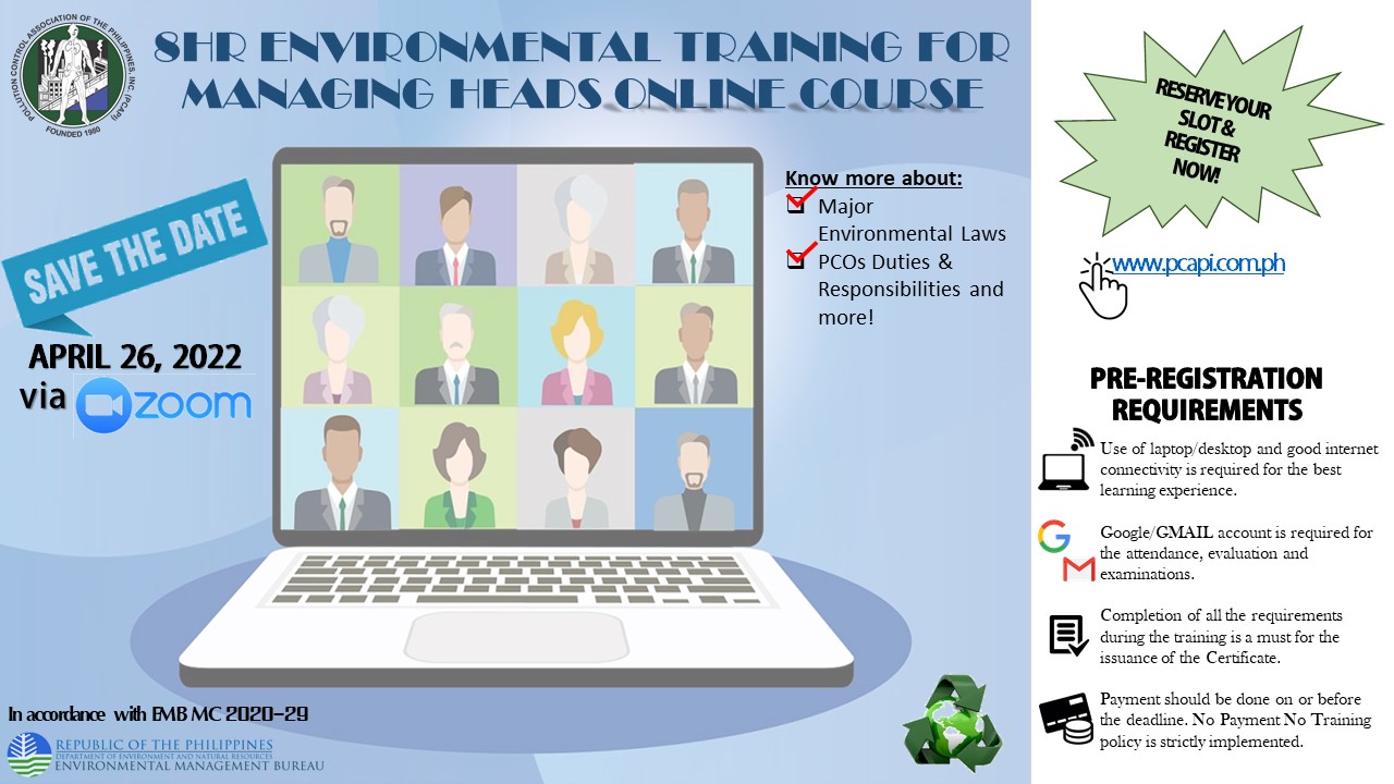 In relation to this, PCAPI NATIONAL, in collaboration with the DENR-EMB is conducting the ONLINE 8 HOURS ENVIRONMENTAL MANAGEMENT TRAINING COURSE FOR MANAGING HEADS required under Section 8 Accreditation of PCOs of the DAO 2014-02 Revised Guidelines for Pollution Control Officer Accreditation. The online training will be conducted in accordance with EMC 2020-29 Guidelines on the Conduct of Online Training for Pollution Control Officers (PCOs) and Managing Heads.
